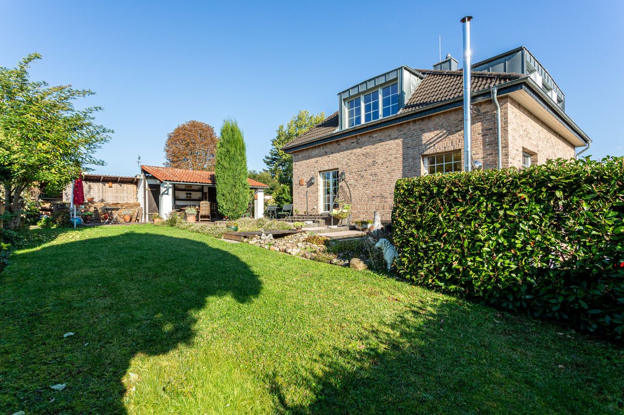 Der Garten ist ein echtes Highlight dieser Immobilie. Er wurde aufwendig und liebevoll angelegt. Im Sommer gibt es Kräuter, viele Rosen und Lavendel. Außerdem noch Apfelbäume. Der Garten ist mit Strom- und Wasserleitungen sowie drei Bodentanks und teilweise Beleuchtung versehen. Daneben befindet sich ein 3.000 ltr. Regenwassertank im Boden für die Bewässerung. Der Außenbereich bietet gleich zwei Terrassen, von denen eine überdacht ist und direkt an einen Gartenschuppen mit zwei Abstellräumen angrenzt.